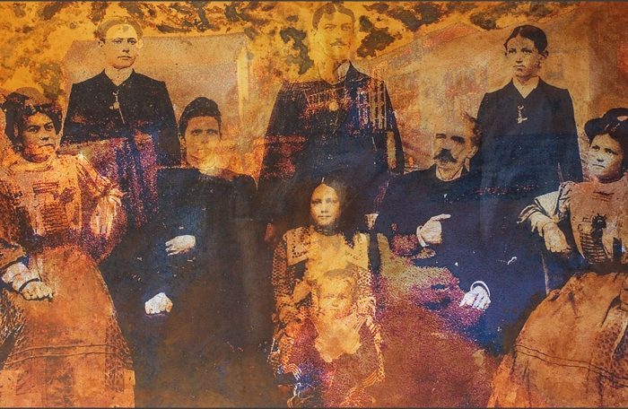 Bernardete CONTE (Caxias do Sul, Brasil, 1948) Família em Santandrá, da série O que escondemos sob as unhas?, 2008 Fotografia digital sobre tela, palha de aço oxidada com vinagre, tela amassada e veladura seca com tinta acrílica, 110 x 13...Gemelas II, da série O que escondemos sob as unhas?, 2008