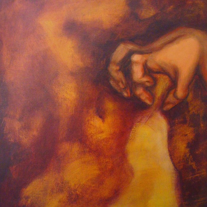 Bernardete CONTE (Caxias do Sul, Brasil, 1948) Triângulo familiar da série O que escondemos sob as unhas?, 2008 Fotografia digitalizada, tela amassada, veladuras com tinta acrílica sobre tela, 100 x 100 cm Coleção da artistaViejo, mi querido viejo, las manos perdonando el tiempo, da série O que escondemos sob as unhas?, 2008