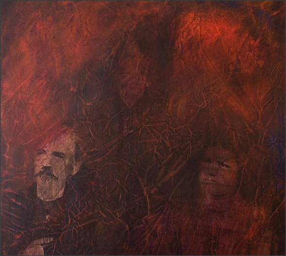 Bernardete CONTE (Caxias do Sul, Brasil, 1948) Triângulo familiar da série O que escondemos sob as unhas?, 2008 Fotografia digitalizada, tela amassada, veladuras com tinta acrílica sobre tela, 100 x 100 cm Coleção da artistaViejo, mi querido viejo, las manos perdonando el tiempo, da série O que escondemos sob as unhas?, 2008